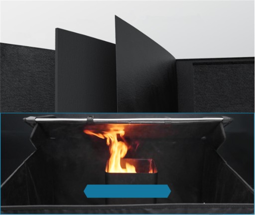 - Trójwarstwowa tkanina ogniotrwała, którą można odpalić pod otwartym płomieniem węgla przez 10 minut bez spalania.