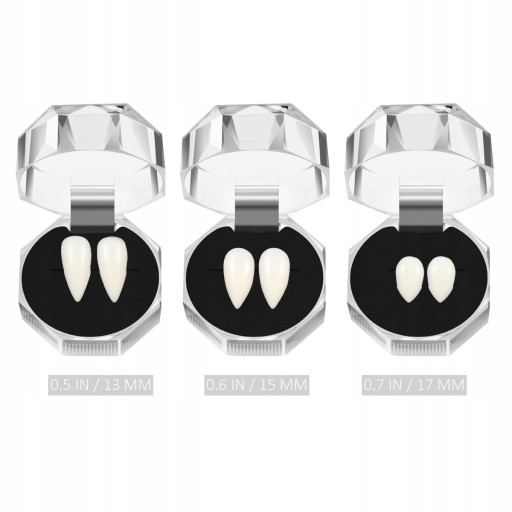 3 pary protez wampirów, w tym 13 mm, 15 mm i 17 mm, każda para jest dostarczana z przezroczystym pudełkiem, bez kleju lub kleju do protez.