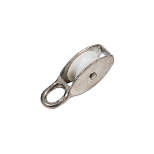 Bloczek budowlany wykonany ze stali, ocynkowany, rolka teflonowa.