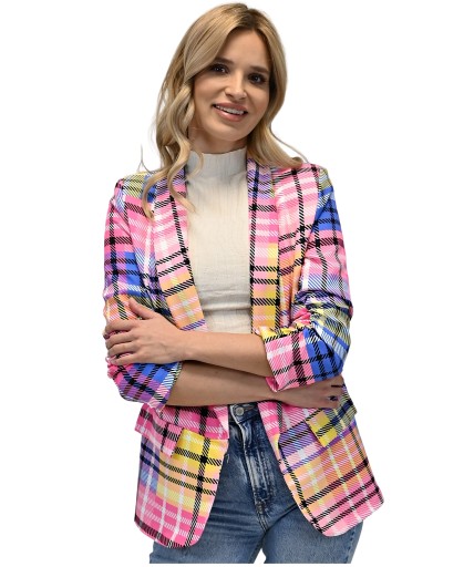 Wyjątkowa, modna, luźna marynarka w oryginalną kolorową kratę w nasyconej kolorystyce. Model dłuższy, smokingowy kołnierz Oryginalnego charakteru dodają drapowane rękawy o długości 3/4. Dwie kieszonki imitacje po bokach z efektownymi klapami upiększają marynarkę. Fason wyszczuplający z podszewką i miękkimi poduszkami w ramionach. Świetna jakość, perfekcyjne wykończenie!