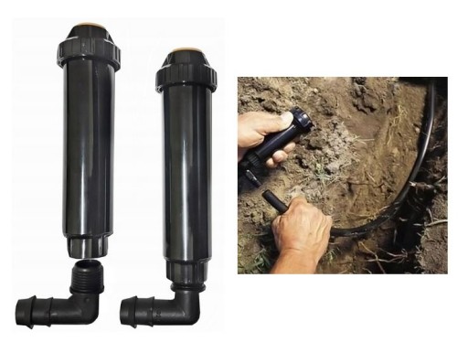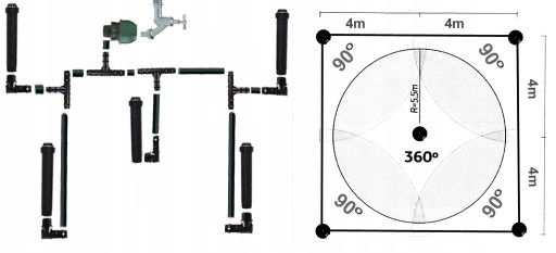 W zestawie znajduje się 6 sztuk wynurzalnych zraszaczy, których kąt zraszania można regulować i wynosi od 90 do 360 stopni.