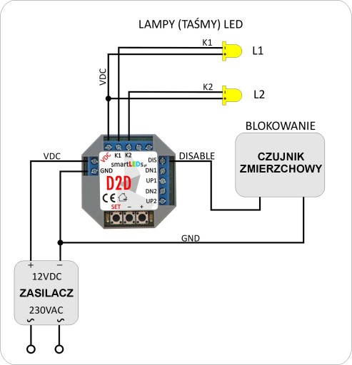 Polski, inteligentny, 2-kanałowy sterownik LED, przeznaczony do włączania, wyłączania oraz sterowania jasnością standardowego oświetlenia LED, takiego jak świecące kostki brukowe, taśmy, listwy, lampy i moduły LED, posiadający możliwość konfiguracji 9 parametrów działania.