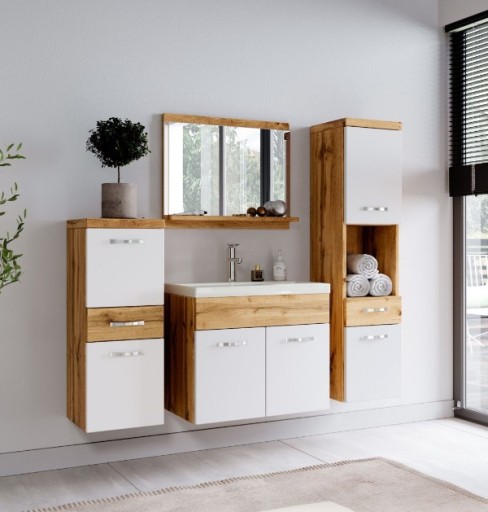 Wisząca szafka pod umywalkę, wyposażona w dwie pakowne komory: