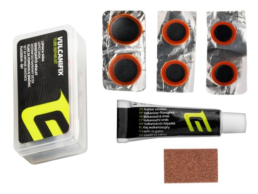 Zestaw dedykowany jest do napraw dętek. Całość zapakowana jest w poręczne pudełko o małych wymiarach (7 x 3,5 x 2 cm).