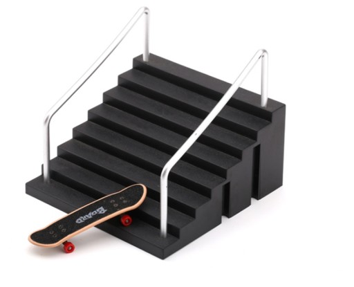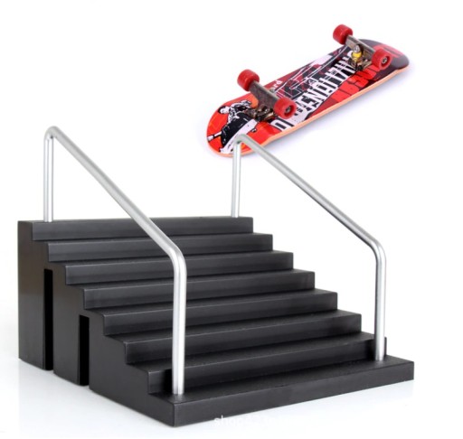 Zestaw składa się z fingerboardu (deskorolki) oraz czarnej rampy w postaci schodów z poręczami, która pozwala na wykonywanie wielu atrakcyjnych akrobacji. Na innych naszych aukcjach dostępne są inne warianty ramp, które można ze sobą dopasowywać tworząc większe moduły.