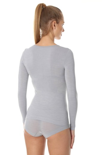 Damska koszulka z długim rękawem, wykonana została z połączenia mikrowłókien i wełny merynosów australijskich dzięki czemu jest delikatna i miła w dotyku. Otuli Twoje ciało, dając poczucie komfortu i luksusu. Konstrukcja dwuwarstwowej dzianiny pozwala na szybki odbiór wilgoci wytworzonej w trakcie codziennych czynności, dając poczucie świeżości przez długi czas. Naturalnymi właściwościami wełny merino jest antybakteryjność. Wełna nie uczula i nada się idealnie dla najdelikatniejszej skóry. Nie przejmuje nieprzyjemnych zapachów, nawet gdy masz przed sobą stresujący i pracowity dzień. Bezszwowe wykończenie nie powoduje otarć i podrażnień, niezależnie od wykonywanych czynności. Idealnie dopasuje się do kształtu Twojej sylwetki podkreślając Twoją kobiecość.