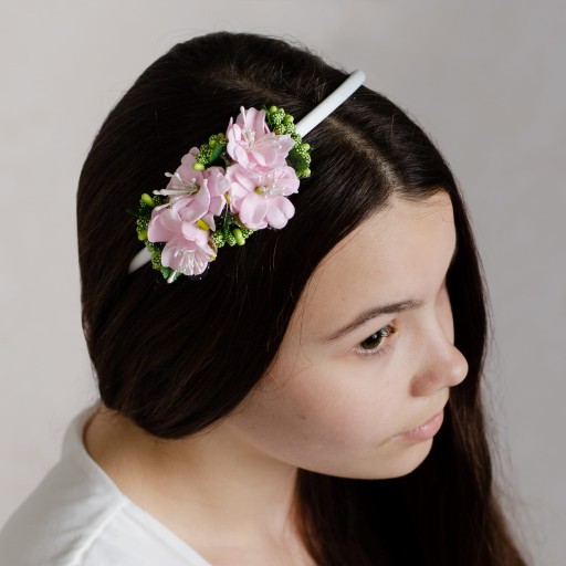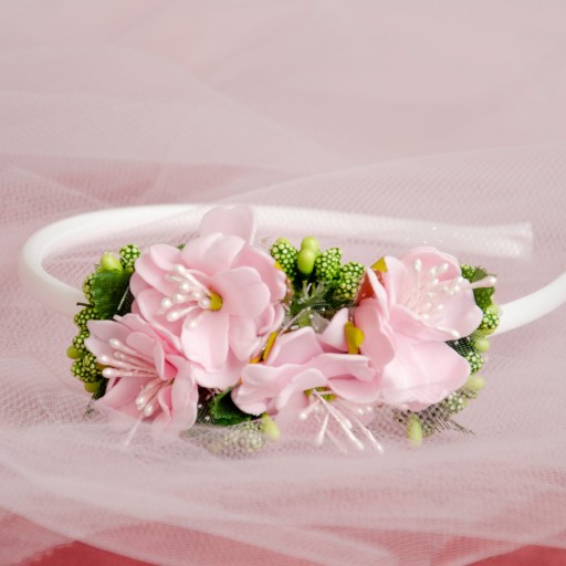 Biała opaska do włosów, ozdobiona piękną aplikacją z piankowych kwiatów. Bardzo ładnie prezentuje się na włosach. Idealnie sprawdzi się jako alternatywna ozdoba, zamiast tradycyjnego wianka, lub jako dodatek na przebranie po uroczystości.