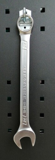 Mocowanie haczyka pasuje do ścianki perforowanej o wymiarach oczka 1cm x 1cm oraz odległości między oczkami 28mm.