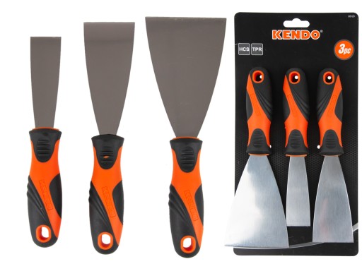 Przedmiotem oferty jest komplet trzech szpachelek stalowych marki Kendo. Komplet wysokiej jakości szpachelek metalowych o szerokości odpowiednio 30, 50, 80 cm, wyprodukowanych na bazie stali nierdzewnej z ergonomicznym uchwytem z PCV, który doskonale trzyma się w dłoni. Szpachle idealnie sprawdzą się w zarówno dużych pracach lakierniczych jak i przy mniejszych remontach, a ich niewielka waga oraz różnorodność rozmiarów pozwalają na zaszpachlowanie nawet trudno dostępnych miejsc.
