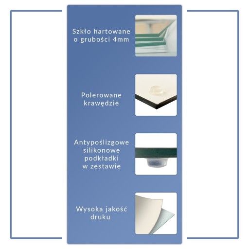 - Do zestawu dołączamy luzem podkładki silikonowe do samodzielnego przyklejenia; wysokość podkładek to około 5mm; zabezpieczają podłoże oraz deski przed porysowaniem, dodatkowo służą jako ochrona antypoślizgowa - szkło się nie ślizga;