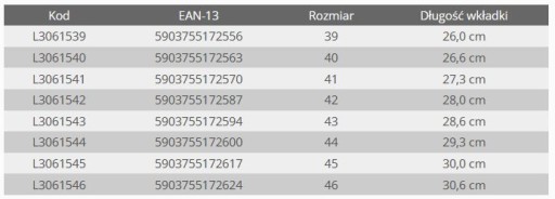 Poniżej tabela z długościami wkładek dla lepszego doboru obuwia.
