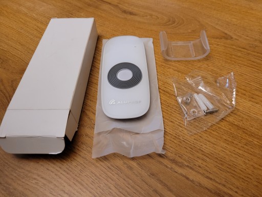 W zestawie znajduje się bateria oraz uchwyt ścienny wraz z kołkami mocującymi.