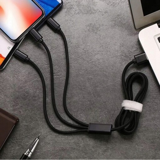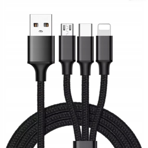 - Kabel 3w1 wyposażony w 3 wtyki do różnych typów gniazd:
