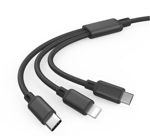Kabel 3w1 wyposażony w 3 wtyki do różnych typów gniazd:
