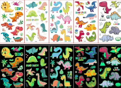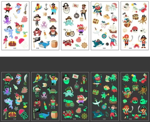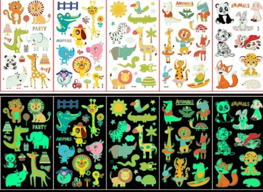 TATUAŻE ZMYWALNE 5 ARKUSZY - PO NAŚWIETLENIU ŚWIECĄ W CIEMNOŚCI - RÓŻNE WZORY DO WYBORU.