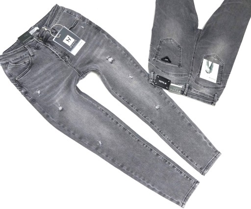 - nogawki zwężane ku dołowi, dopasowane typu rurki z małymi dziurami, przetarciami
