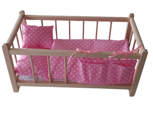 Łóżeczko wykonane z drewna bukowego,co zdecydowanie zwiększa trwałość i zapewnia wygląd zbliżony do ich dużego odpowiednika. W kołderkę wszyta owata puszysta i kolorowe ozdobne tasiemki.Organizer można wiązać na dowolny bok łóżeczka.Kolorowe tasiemki są wszywane losowo, pod kolor bawełny.  Możliwość uszycia różnych wielkości na życzenie klienta. Drewniana konstrukcja jest nielakierowana, można ją pomalować według własnego uznania. Łóżeczko wysyłane jest w całości