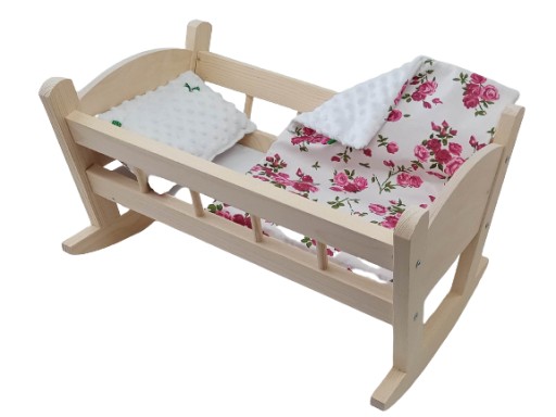 Urocza kołyska drewniana dla lalek, wykonana z drewna świerkowego.