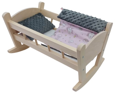 Urocza kołyska drewniana dla lalek, wykonana z drewna świerkowego.