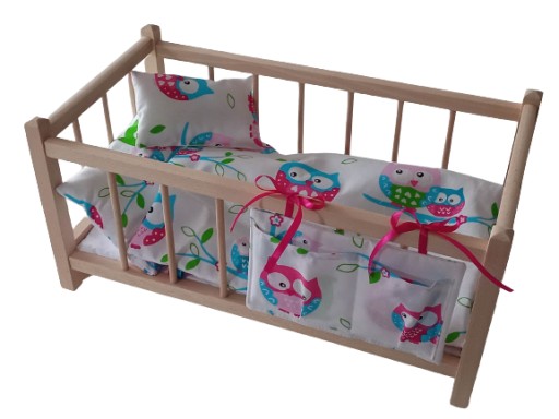 Łóżeczko wykonane z drewna bukowego,co zdecydowanie zwiększa trwałość i zapewnia wygląd zbliżony do ich dużego odpowiednika. W kołderkę wszyta owata puszysta i kolorowe ozdobne tasiemki.Organizer można wiązać na dowolny bok łóżeczka.Kolorowe tasiemki są wszywane losowo, pod kolor bawełny. Drewniana konstrukcja jest nielakierowana, można ją pomalować według własnego uznania. Łóżeczko wysyłane jest w całości