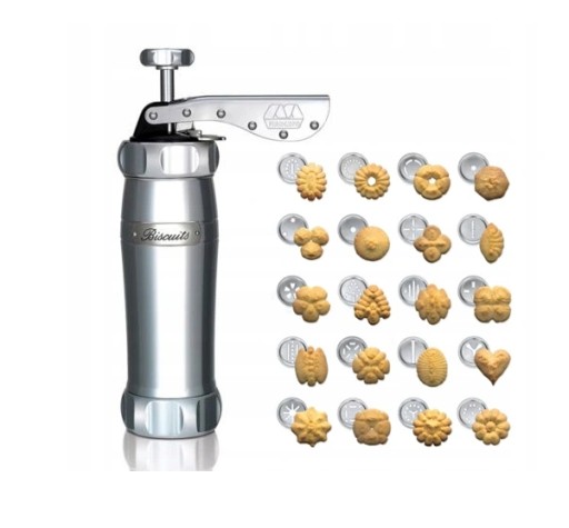 DOMOWA MASZYNA DO CIASTEK Maszynka do robienia domowych ciastek w prosty, szybki i przyjemny sposób. Biscuits pozwala napełnić całą blachę piekarnika herbatnikami w ciągu kilku minut, w 20 różnych kształtach i 2 rozmiarach, które możesz udekorować według własnego uznania. Dzięki wzornictwu w stylu retro, modnym kolorom i najnowocześniejszym materiałom Biscuits jest użytecznym i doskonałym dodatkiem uzupełniającym wystrój Twojej kuchni.