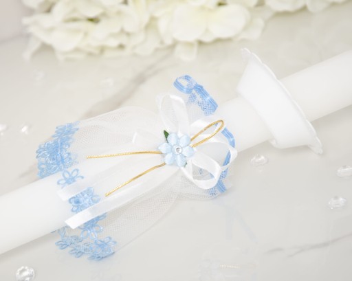 Biały, delikatny stroik na świecę. Piękny element dekoracyjny, który doda uroku każdej świecy. Idealna ozdoba do gromnicy komunijnej lub do chrztu. Delikatny niebieski akcent, będzie pasował na świecę dla chłopca. Stroik sprzedawany jest w zestawie okapnikiem na świece.