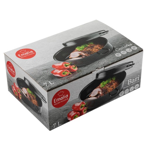 Brytfanna emaliowana Emalia Polska Pleszew ma pojemność 7 l. Idealna do gotowania, smażenia i pieczenia. Wykonana ze stali węglowej i pokryta powłoką emaliowaną, która jest wolna od szkodliwych związków.