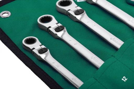 Zestaw kluczy płasko-oczkowych łamanych z grzechotką i blokadą