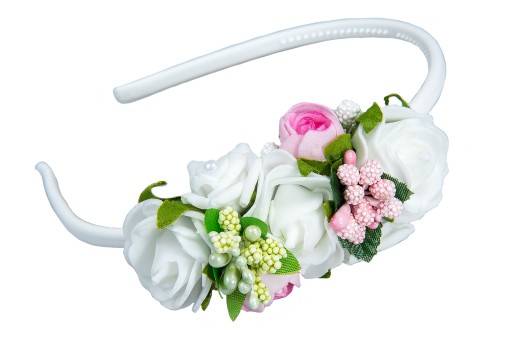 Efektowna opaska komunijna wykonana z wysokiej jakości różyczek piankowych. Różyczki piankowe wyglądają bardzo naturalnie a perełki dodają stroikowi elegancji. Idealna na biały tydzień lub przebranie wianka.