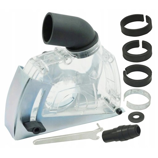 Osłona przeciwpyłowa z króćcem odsysającym do szlifierek kątowych 115 i 125mm. Osłonę mocuje się do kołnierza wrzeciona w miejsce standardowej osłony metalowej.