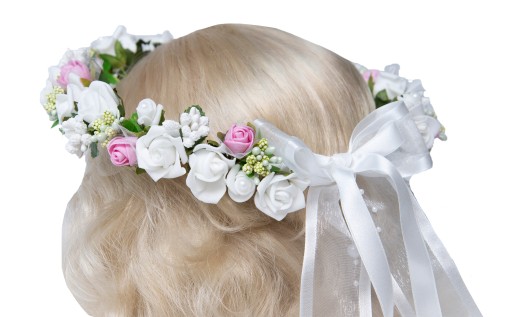 Przedmiotem oferty jest piękny wianek komunijny wykonany ręcznie z kwiatów piankowych oraz dodatków florystycznych.