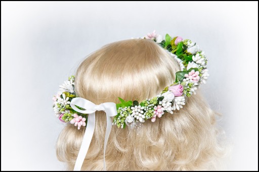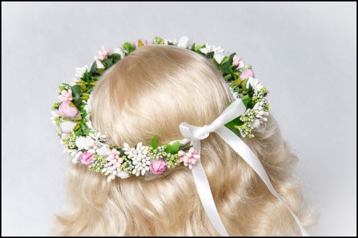 Realistyczny wygląd kwiatów, dodatków oraz wykończenie atłasową kokardą nadają delikatnego i eleganckiego wyglądu dziewczynce w tym ważnym dniu.