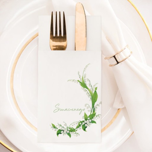 Gotowy zestaw dekoracji stołu na Komunię w postaci serwetek, bieżnika i kieszonek. W prosty sposób można stworzyć efektowną aranżację stołu.