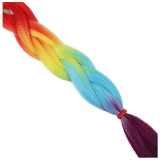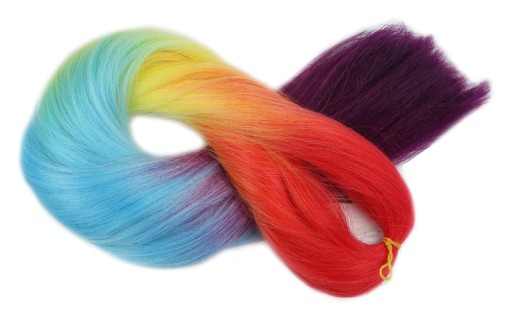 Włosy syntetyczne w przepięknym wariancie kolorystycznym -czerwono-żółto-niebiesko-fioletowym. Wykonane z gładkiego i przyjemnego w dotyku henlonu.