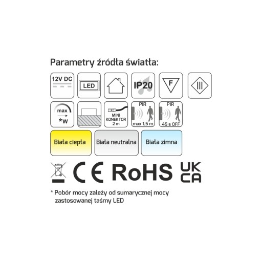 - barwy światła: biała ciepła, zimna lub neutralna,
