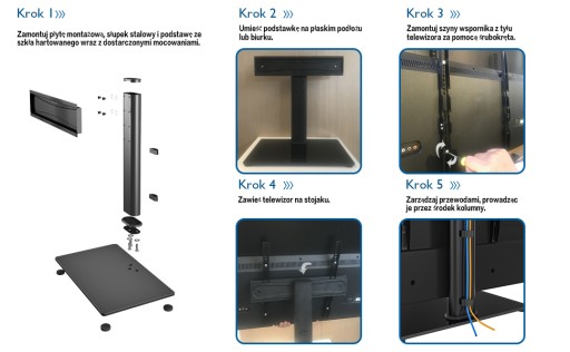 stojak dostarczany jest ze wszystkimi niezbędnymi instrukcjami dotyczącymi sprzętu i instalacji (mogą nie być dostępne w języku polskim). Stojak nie wymaga wiercenia otworów w ścianie. Zainstaluj nasz stojak pod telewizor bez żadnych problemów.