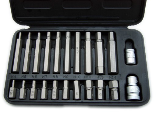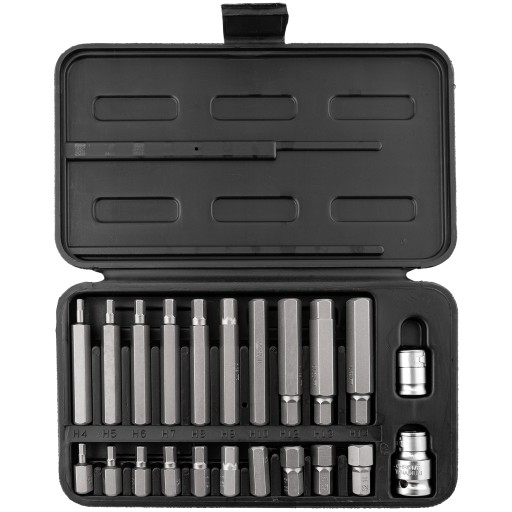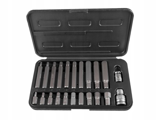 Zestaw 22-elementowy kluczy imbusowych wewnętrznych 3/8”, 1/2”. W zestawie znajdują się wewnętrzne klucze imbusowe długie oraz wraz z mocowaniem na klucze grzechotkowe w dwóch najpopularniejszych rozmiarach. Wykonane ze stali stopowej narzędziowej S2, charakteryzują się wysoką twardością (HRC 58-62) i zwiększona wytrzymałością na ścieranie. Bity mają średnice mocowania 10 mm. Zestaw umieszczony w kasecie wykonanej z tworzywa sztucznego Każda nasadka w zestawie ma uporządkowane miejsce. Organizer zamykany na zatrzask pozwala na łatwe uporządkowanie nasadek oraz szybki dostęp do każdej.