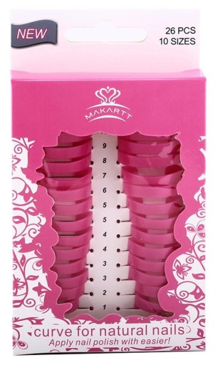 Zestaw 26 osłonek na paznokcie, które skutecznie chronią przed nieumyślnym zabrudzeniem skórek wokół paznokci podczas malowania. Występują w 10 rozmiarach, byś mogła dopasować osłonkę pod każdego palca indywidualnie, dla swobody i komfortu malowania.