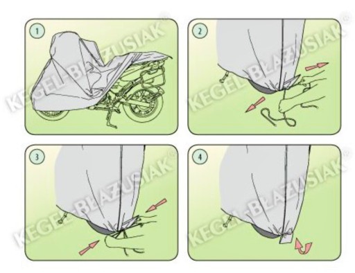 - Wkładać na względnie czysty motocykl białą stroną pasa środkowego do wewnątrz a następnie maksymalnie mocno zaciągnąć linkę ściągacza pokrowca i prawidłowo ją zawiązać. Tylko właściwe sznurowanie zagwarantuje wytrzymałość wiązania. Zawiąż linkę zgodnie z instrukcją, a będziesz miał pewność, że pokrowiec przymocowany jest trwale i silnie a tym samym, że Twój pojazd jest w pełni bezpieczny. Zalecane wiązanie powzwoli na mocne scalenie dwóch końców linki, jednocześnie dając możliwość szybkiego jej rozwiązania.