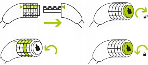 - Aby ponownie otworzyć zamknięcie należy ustawić swój wprowadzony kod tam gdzie wskazuje strzałka.