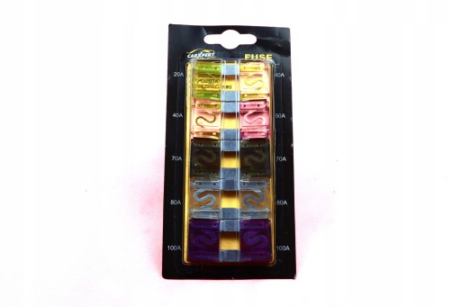 Komplet płytkowych bezpieczników elektrycznych, chroniących instalacje elektryczne przed ich uszkodzeniem z powodu wystąpienia nadmiernego natężenia prądu.