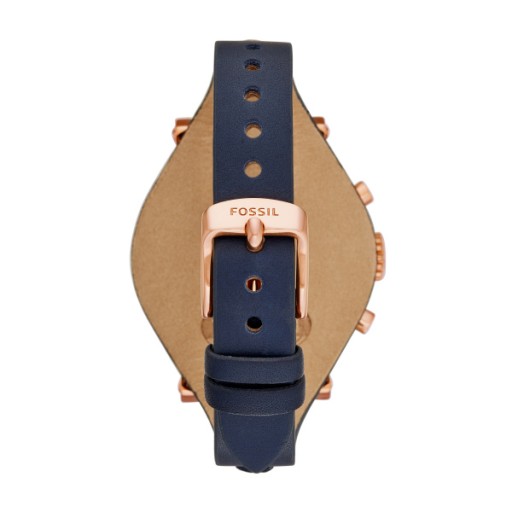 Oryginalny pasek do zegarka marki Fossil Boyfriend do modelu ES3838 wykonany ze skóry naturalnej w kolorze granatowym, gładki, matowy, z podkładką, sprzączka wykonana ze stali nierdzewnej w kolorze różowego złota. Na pasku ozdobne ćwieki w kolorze różowego złota.