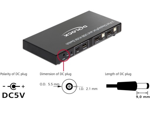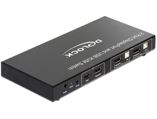 Przełącznik KVM firmy Delock jest wygodnym rozwiązaniem pozwalającym podłączyć dwa komputery z wyjściem DisplayPort do jednego monitora DisplayPort i / lub jednego monitora HDMI. Używając przycisku, lub pilota, można przełączać się między dwoma komputerami. Dodatkowo, urządzenie posiada wyjścia DisplayPort i HDMI do podłączenia dwóch monitorów, z których tylko jeden może być aktywny w danym czasie. Trzy gniazda USB Typ-A mogą być użyte do podłączenia myszy, klawiatury, dysku twardego lub pamięci USB. Wbudowana funkcja zestawu słuchawkowego USB pozwala na korzystanie z mikrofonu i zestawu słuchawkowego z obydwoma komputerami.