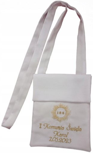 Na sakiewce wyhaftujemy napis I KOMUNIA ŚWIĘTA, imię i datę komunii