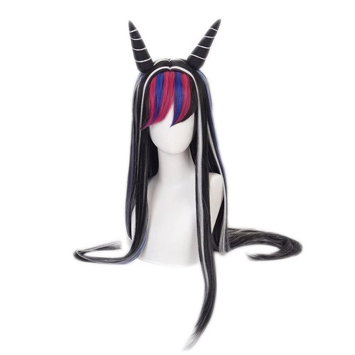 PERUKA COSPLAY CZARNA DŁUGA Z PASEMKAMI W KOLORZE RÓŻOWYM, NIEBIESKIM ORAZ BIAŁYM