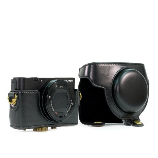 Skórzane etui z osłoną obiektywu, które chronią aparat i obiektyw, pozwalając jednocześnie na szybkie robienie zdjęć.