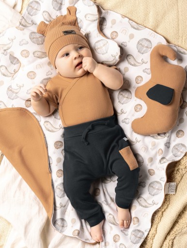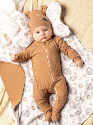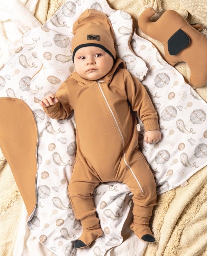 Sportowa bluza boomerka dla chłopca, z bawełny dresowej w kolorze karmelowym z niewielką ilością elastanu.Fason ten to nasz bestseller. Świetnie wygląda na każdej sylwetce. Przy rękawach, szyji oraz w pasie wszyto ściągacze pod kolor modelu. Zapinana jest na zamek.Przód zdobi naszyta naszywka z wielorybem. Materiał posiada certyfikat Oeko-Tex Standard 100 Tekstylia godne zaufania.