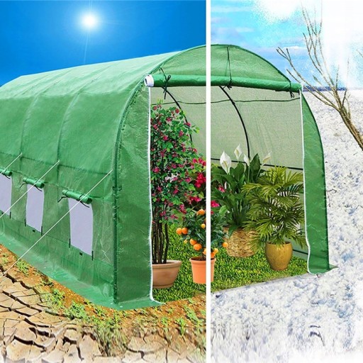 - SPECYFIKACJA – kolor: zielony; materiał: PE 140g/m2; ilość wejść: 1; ilość okien: 8 (okna z moskitierą); ilość sekcji: 4; wymiary (dł/szer/wys): 400/200/200cm; waga: 5kg; w zestawie: folia pasująca do stelażu 4x2x2m.