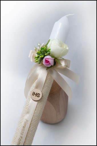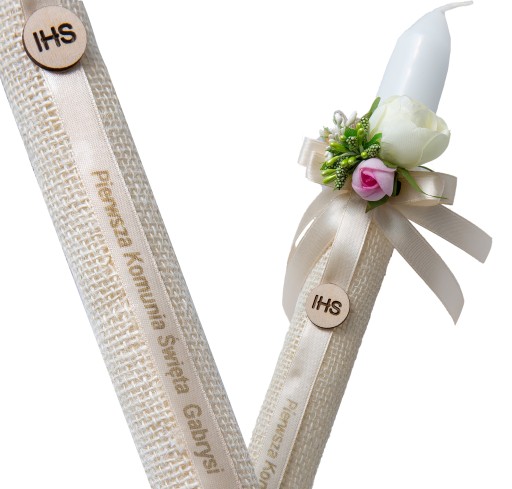 Wyjątkowa ręcznie zdobiona świeca do Pierwszej Komunii Świętej z personalizowaną wstążką. Na wstążce umieszczony jest napis Pierwsza Komunia Święta i imię dziecka.