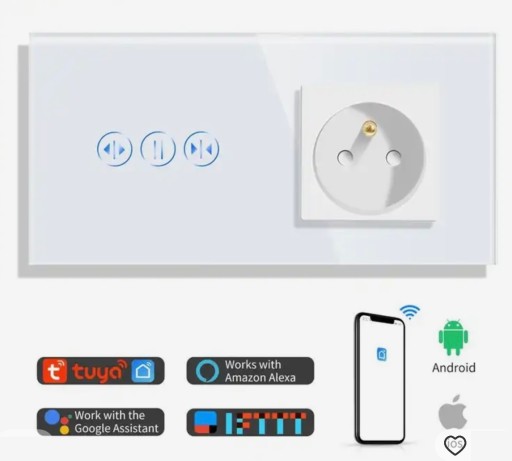 Dotykowy sterownik przełącznik rolet - żaluzji z gniazdkiem elektrycznym w kolorze białym, obsługiwany za pomocą WiFi oraz aplikacji TUYA lub SMART LIFE.